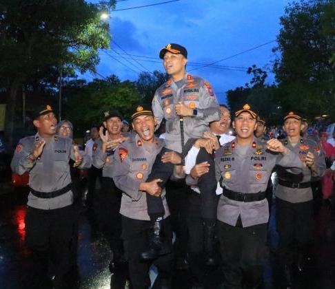 Meskipun cuaca diwarnai rintik gerimis, antusiasme personel tetap tinggi. Momen krusial terjadi saat para Pejabat Utama (PJU) Polres Ngawi melakukan aksi spontan dengan mengangkat tubuh AKBP Prayoga. Secara semiotik, tindakan ini mencerminkan high-level of trust dan harapan besar seluruh jajaran terhadap visi kepemimpinan baru.