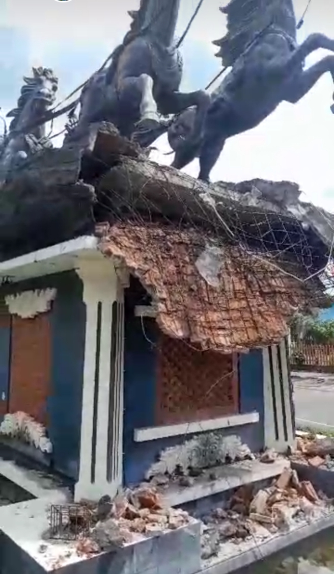 Kerusakan terparah terjadi pada bagian lantai depan patung kuda sebelah timur. Material bangunan berupa bata merah, anyaman besi eser, dan pecahan beton berjatuhan ke bawah. Dari pengamatan di lokasi, terlihat jelas bahwa proses pembangunan patung ini terindikasi asal-asalan, dengan penempelan besi dan material yang tampak menggantung di sisi bangunan.