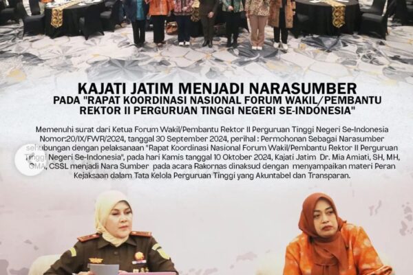 Surabaya.Frekwensipos.Com – Kajati Jatim Dr. Mia Amiati, S.H., M.H., CMA., CSSL., menjadi Nara Sumber Rapat Koordinasi (Rakor) Forum Wakil/Pembantu Rektor II Perguruan Tinggi Negeri (PTN) se-Indonesia. Kamis (10/10) Kajati Mia Amiati hadir dalam rangka memenuhi surat dari Ketua Forum Wakil/Pembantu Rektor II Perguruan Tinggi Negeri (PTN) Se-Indonesia Nomor : 20/ IX/ FWR/ 2024, tanggal 30…