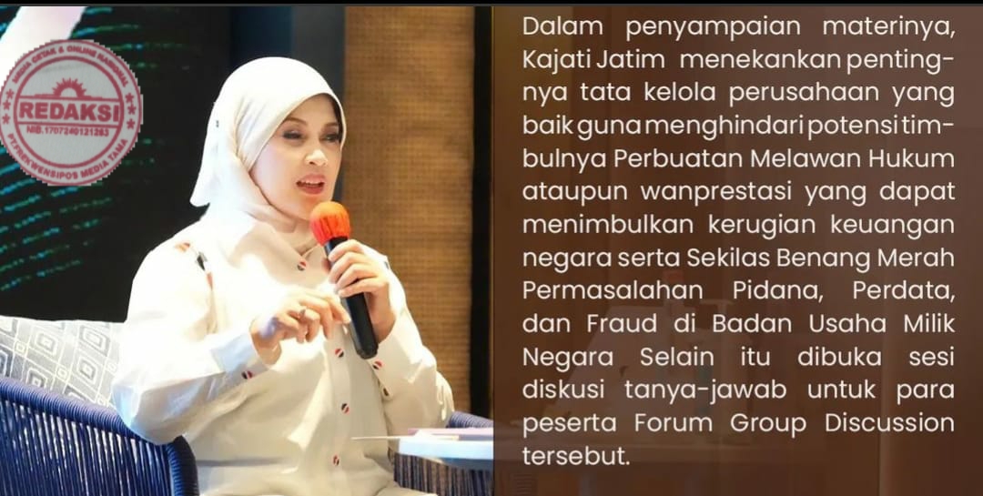 Dalam penyampaian materinya, Kajati Jatim menekankan pentingnya tata kelola perusahaan yang baik guna menghindari potensi timbulnya Perbuatan Melawan Hukum ataupun wanprestasi yang dapat menimbulkan kerugian keuangan negara.