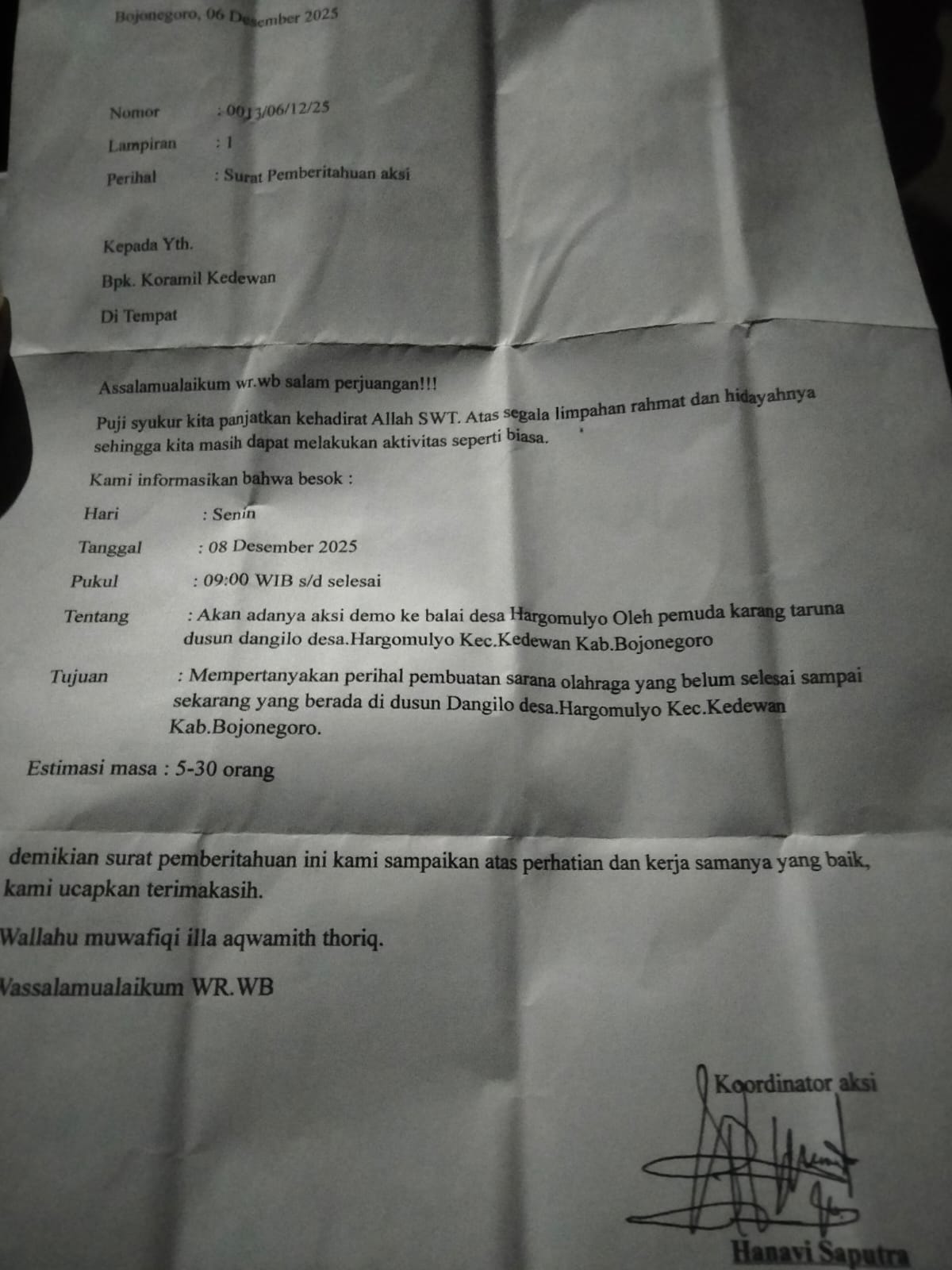 Bojonegoro.FrekwensiPos.Com – Rencana demonstrasi yang diinisiasi oleh pemuda Karang Taruna Dusun Dangilo, Desa Hargomulyo, Kecamatan Kedewan, Kabupaten Bojonegoro, pada Senin (08/12/2025), urung dilaksanakan. Aksi ini sebelumnya direncanakan sebagai puncak kekecewaan warga terhadap dugaan maladministrasi dan kurangnya transparency dalam proyek pembangunan sarana olahraga lapangan voli yang didanai oleh Dana Desa (DD) tahun 2024 senilai Rp73 juta.