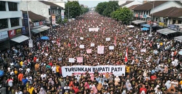 Pati, Jawa Tengah.FrekwensiPos.Com – Ratusan ribu demonstran membanjiri Kota Pati, Jawa Tengah, hari ini, melumpuhkan pusat kota dan mengintensifkan tuntutan untuk pengunduran diri Bupati Sudewo. Mobilisasi massa yang masif ini, dimulai sekitar pukul 07.30 WIB, mengubah area Alun-Alun menjadi episentrum gejolak publik yang berpotensi memanas, mengindikasikan adanya pergolakan signifikan dalam tata kelola pemerintahan daerah.